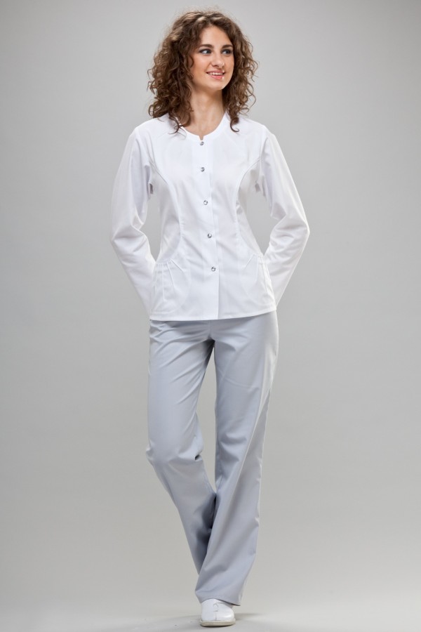 Leicht taillierter Kasack mit Druckknöpfen, V-Ausschnitt und 2 Seitentaschen.