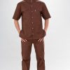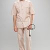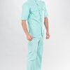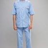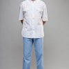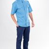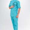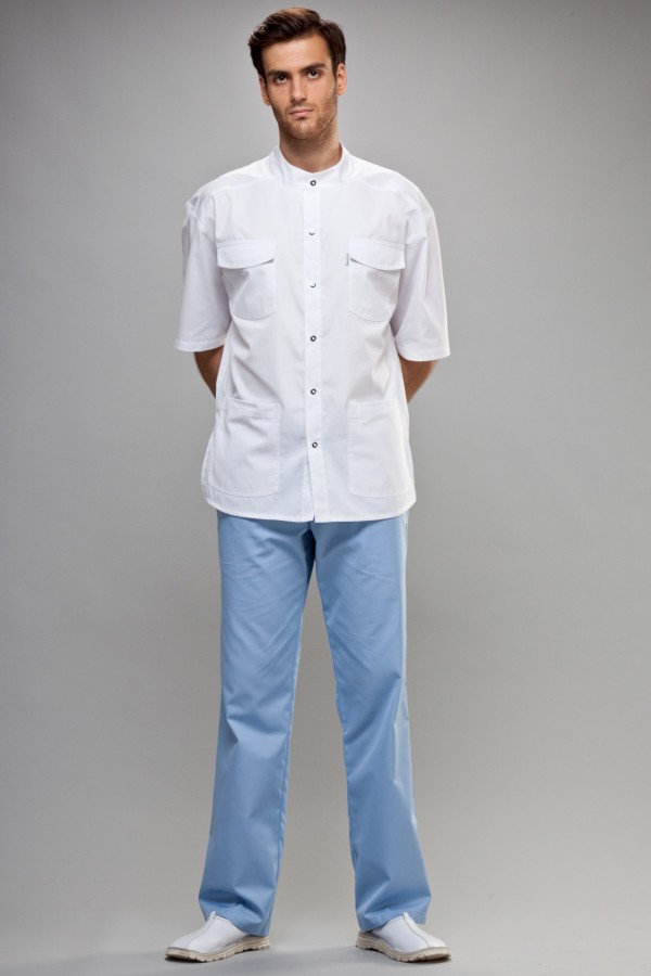 | Stoffe | Kleidung in Farben: Weiss, Blau, Blassgrün, Gelb, Grau, Kiwi, Beige, Braun, Schwarz, Lavendel, Pflaume, Dunkelblau, Azurblau, Türkis, Magenta und Koralle wird aus italienischer Polyester – Baumwollmischung (50% Baumwolle, 50% Polyester) hergestellt. Dunkelgrün: Material 33% Baumwolle, 67% Polyester |