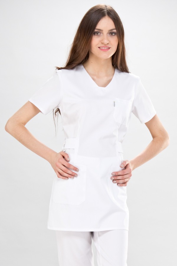Leicht taillierter Kasack mit seitlichen und hinteren Druckknöpfen, leichter U-Ausschnitt,